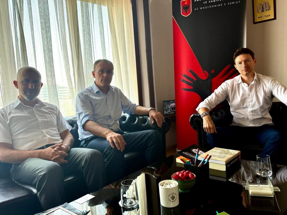 Ambasadori i Republikës së Shqipërisë në Shkup, Denion Meidani sot ka pritur në një takim dy profesorët univesrsitar Fehari Ramadanin dhe Bashkim Ziberin, me të cilët ambasadori Meidani diskutoi për për projekte bashkëpunimi ndërmjet universiteteve tona, Akademisë së Shkencave të Shqipërisë dhe Arkivit të Shtetit; ura që lidhin breza dhe dije, shkruan Top24.