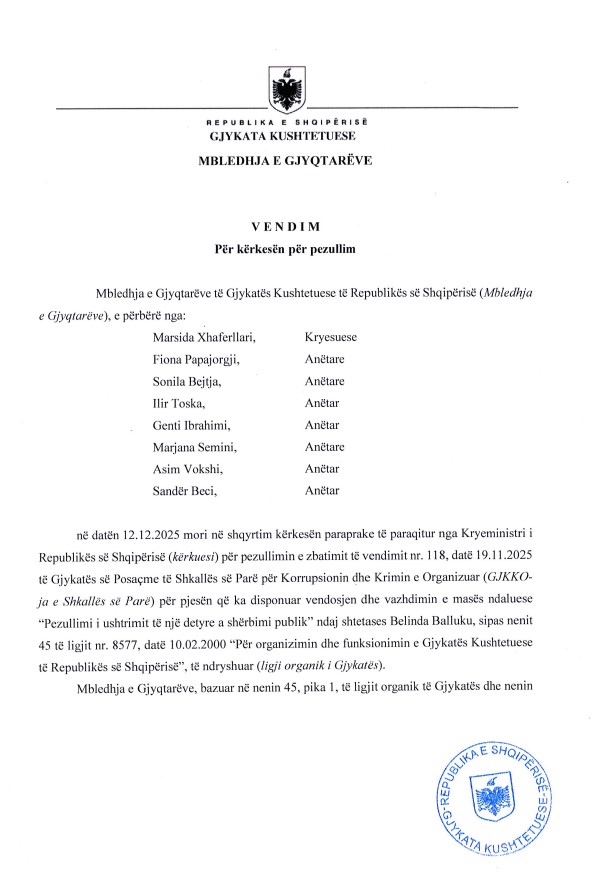 Në datën 12.12.2025 mori në shqyrtim kërkesën paraprake të paraqitur nga Kryeministri i Republikës së Shqipërisë (kërkuesi) për pezullimin e zbatimit të vendimit nr. 118, datë 19.11.2025 të Gjykatës së Posaçme të Shkallës së Parë për Korrupsionin dhe Krimin e Organizuar (GJKКОja e Shkallës së Parë) për pjesën që ka disponuar vendosjen dhe vazhdimin e masës ndaluese “Pezullimi i ushtrimit të një detyre a shërbimi publik” ndaj shtetases Belinda Balluku, sipas nenit 45 të ligjit nr. 8577, datë 10.02.2000 “Për organizimin dhe funksionimin e Gjykatës Kushtetuese të Republikës së Shqipërisë”, të ndryshuar (ligji organik i Gjykatës). Mbledhja e Gjyqtarëve, bazuar në nenin 45, pika 1, të ligjit organik të Gjykatës dhe nenin 27 të Rregullores për Procedurat Gjyqësore të Gjykatës Kushtetuese (Gjykata),