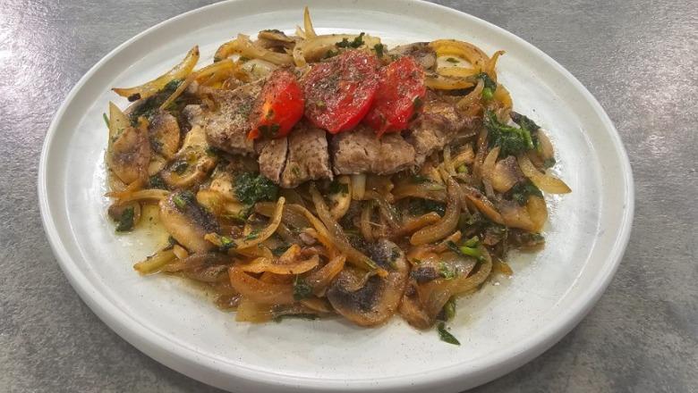 Presim biftekët në fileto me trashësi rreth 3 cm. I rrahim lehtë nga njëra anë me rrahëse mishi, i spërkatim me kripë e piper dhe sipas dëshirës mund t’i lyejmë me pak mustardë. Në një tigan me yndyrë të nxehtë, skuqim filetot nga të dyja anët për 4-5 minuta, derisa të marrin ngjyrë të artë. E vendosim mishin në një pjatë të nxehtë. Në të njëjtin tigan, hedhim qepët e prera në rrathë dhe i kaurdisim për 3-4 minuta derisa të zbuten. Më pas shtojmë kërpudhat e pastruara e të prera, kripë, piper dhe majdanozin e grirë hollë. E lëmë të lidhet dhe të marrë formën e një salce të cilën e hedhim mbi biftekët e filetuar. E shërbejmë menjëherë të nxehtë shoqëruar me pak oriz, patate të skuqura ose bizele.