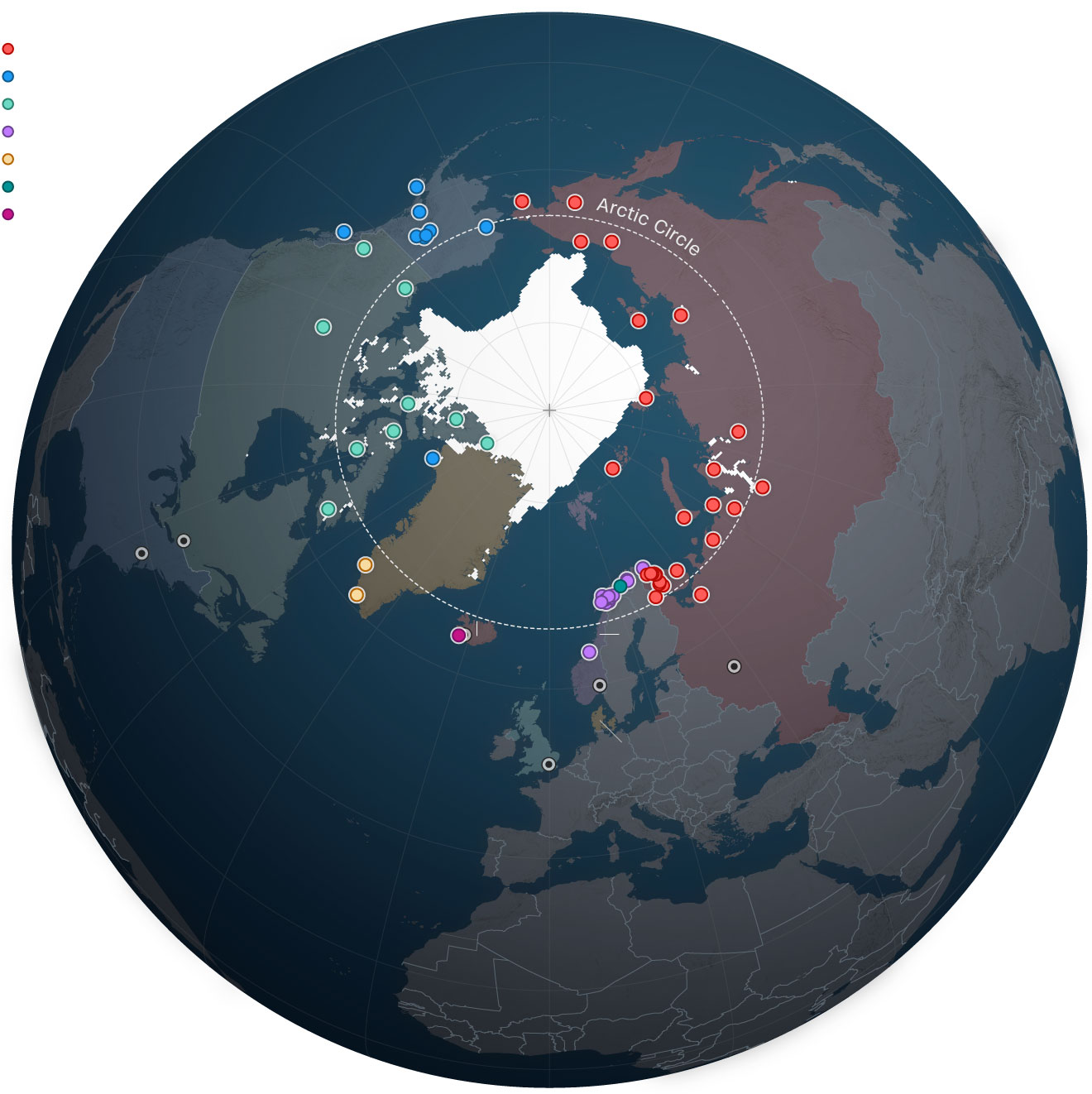 Sipas të dhënave publike dhe kërkimeve të Fondacionit Simons, 30 prej tyre janë në Rusi dhe 36 në vendet e NATO-s që kanë territor arktik: 15 në Norvegji – përfshirë një bazë britanike – tetë në Shtetet e Bashkuara, nëntë në Kanada, tre në Groenlandë dhe një në Islandë.