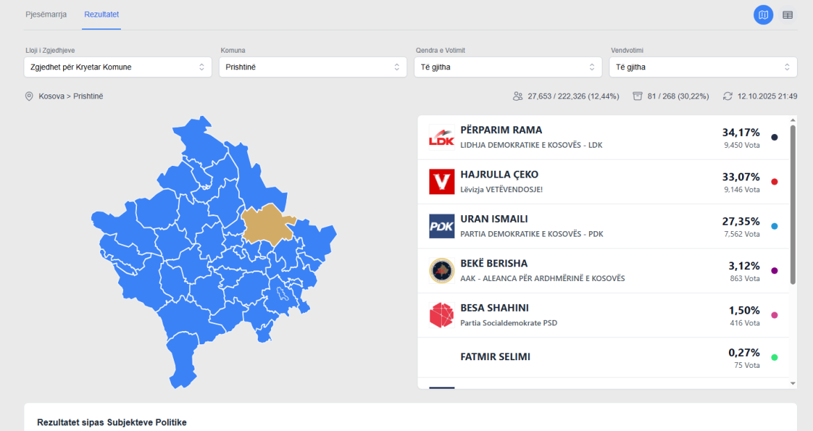 Në Prishtinë, garë e ngushtë po zhvillohet mes kandidatit të LDK-së, Pëprarim Rama dhe Hajrullah Çekut të VV-së.