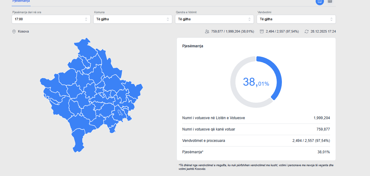 Sipas KQZ-së, deri në ora 17:00 kanë votuar 38.01% apo 759 mijë e 877 qytetarë.