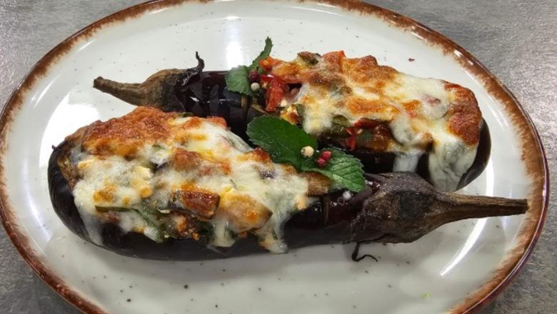 Presim kapakët e patëllxhanëve, hapim brenda tyre një zgavër dhe bëjmë prerje të lehta në brendësi. Shtojmë pak kripë, vaj ulliri dhe i pjekim në furrë të parangrohur në 180°C për 35–40 minuta. Më pas heqim me një lugë tulin e brendshëm dhe e hedhim në një tas ku shtojmë domaten e grirë, specin e kuq, specin djegës, hudhrën e grirë, djathin e bardhë, vajin e ullirit, kripën, rigonin dhe piperin. I përziejmë mirë dhe me këtë masë mbushim patëllxhanët. Bëjmë një spërkatje mbi mbushje me djathë kaçkavall dhe e vendosim tavën në pjekje për 15–20 minuta në 200°C.