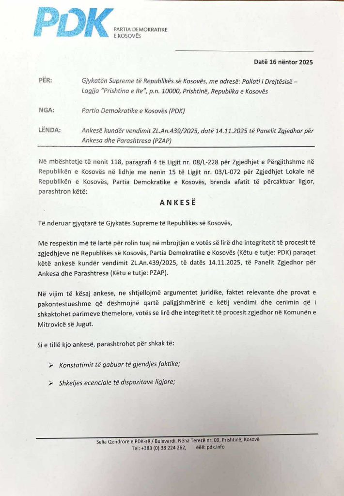 Home Kosova PDK e çon në Gjykatë Supreme çështjen e zgjedhjeve në Mitrovicë, pasi iu rrëzua nga PZAP