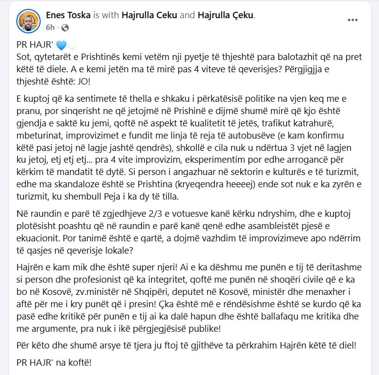 Në statusin e tij të gjatë në Facebook, të cilin më pas e ka fshirë, Toska kritikon qeverisjen lokale të kaluar dhe argumenton pse, sipas tij, Prishtina duhej ta mbështeste sërish kandidatin e Lëvizjes Vetëvendosje. Ai përmendte “punën e dëshmuar”, “integritetin” dhe “profesionalizmin” e Çekut.