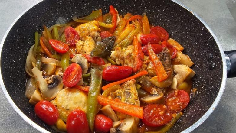 Në një tenxhere të gjerë ngrohim gjysmën e vajit në nxehtësi mesatare në të fortë. Hedhim copat e pulës dhe i skuqim derisa të marrin ngjyrë të artë nga çdo anë. I heqim mënjanë. Në të njëjtën tenxhere shtojmë vajin e mbetur, hedhim qepët (2 të grira dhe 1 në feta) dhe tre llojet e specave prerë në shirita. I lëmë të zbuten pak dhe të shkëlqejnë, më pas shtojmë kërpudhat dhe vazhdojmë kaurdisjen edhe 2–3 minuta. Rikthejmë pulën në tenxhere duke e futur mes perimeve. Shtojmë sheqerin, dafinën, kripën dhe piperin. E përziejmë lehtë dhe e shuajmë me birrë. Sapo të avullojë alkooli shtojmë domatet e grira dhe lëngun e domates. Kur të marrë valë, ulim nxehtësinë, e mbulojmë me kapak dhe e lëmë të gatuhet për 45–60 minuta, derisa pula të zbutet dhe salca të lidhet. Nëse thahet shpejt, shtojmë pak ujë të nxehtë. Nëse dëshirojmë salcë më të trashë e lëmë 5–10 minuta pa kapak në fund.
