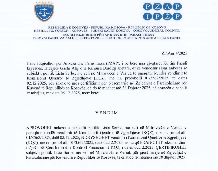 “APROVOHET ankesa e subjektit politik Lista Serbe, me seli në Mitrovicën e Veriut, e paraqitur kundër vendimit të Komisionit Qendror të Zgjedhjeve (KQZ), me nr. protokolli 01/3562/2025, datë 02.12.2025, NDRYSHOHET vendimi i Komisionit Qendror të Zgjedhjeve (KQZ), me nr. protokolli 01/3562/2025, datë 02.12.2025, ashtu që PRANOHET rekomandimi i Zyrës për Çertifikim dhe Kontroll Financiar në KQZ, i datës 02.12.2025, ÇERTIFIKOHEТ subjekti politik Lista Serbe, me seli në Mitrovicën e Veriut, për pjesëmarrje në Zgjedhjet e Parakohshme për Kuvendin e Republikës së Kosovës, të cilat do të mbahen më 28 dhjetor 2025”, thuhet në vendim.