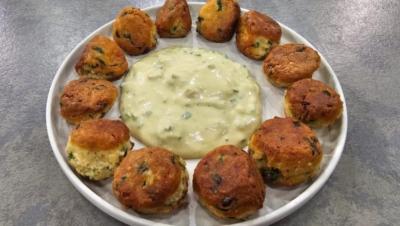 Në një tas përziejmë gjizën, vezët, piperin, arrën moskatin, majdanozin, mendrën, qepët e grira imët, vajin e ullirit, hudhrat, sodën dhe miellin. I punojmë me dorë derisa të lidhen mirë dhe të bëhet një masë e qëndrueshme. Rregullojmë shijen me kripë dhe i lemë të pushojnë 20–30 minuta që të marrin aromë. Në një pjatë përziejmë miell me pak peksimadhe. Formojmë qofte të sheshta me dorë, i kalojmë në miell nga të dyja anët dhe i vendosim në pjatë. Në tiganin me vaj të nxehtë skuqim qoftet derisa të marrin ngjyrë të kuqërremtë. I vendosim mbi letër kuzhine për të thithur vajin e tepërt dhe më pas i shërbejmë duke i spërkatur me majdanoz të grirë.