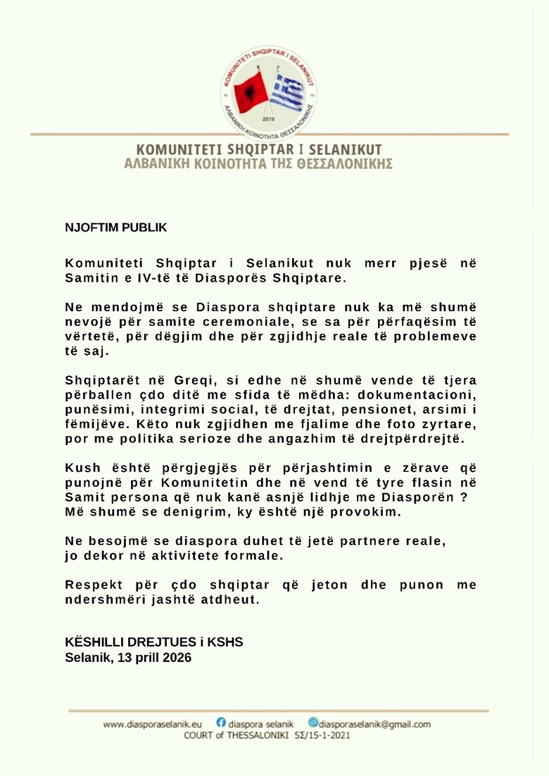 “Shqiptarët në Greqi, si edhe në shumë vende të tjera përballen çdo ditë me sfida të mëdha: dokumentacioni, punësimi, integrimi social, të drejtat, pensionet, arsimi i fëmijëve. Këto nuk zgjidhen me fjalime dhe foto zyrtare, por me politika serioze dhe angazhim të drejtpërdrejtë. Kush është përgjegjës për përjashtimin e zërave që punojnë për Komunitetin dhe në vend të tyre flasin në Samit persona që nuk kanë asnjë lidhje me Diasporën? Më shumë se denigrim, ky është një provokim”, thotë deklarata.