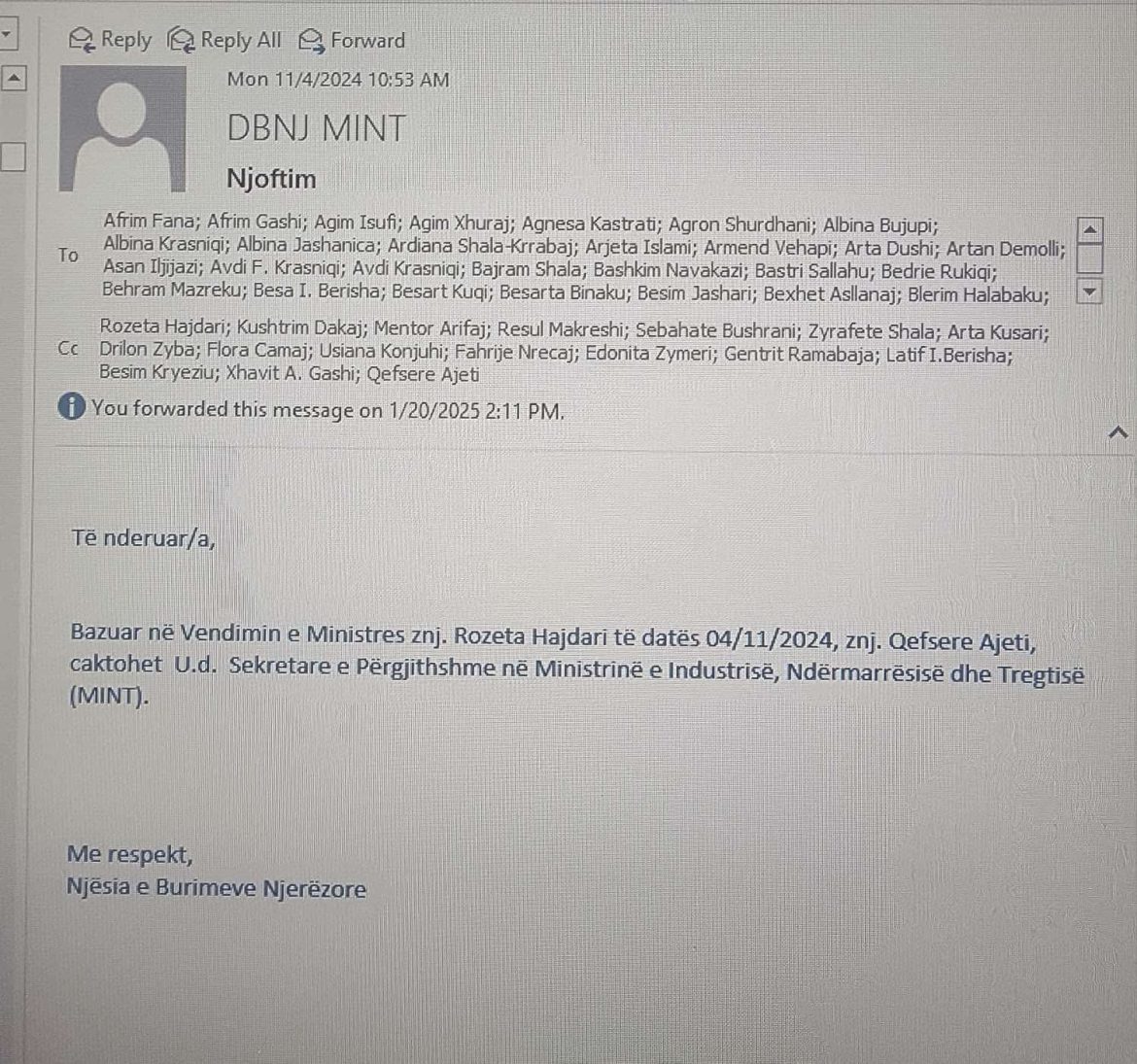 Ky njoftim është nxjerrë më 23 dhjetor të vitit të kaluar, rreth një muaj pas vendimit të ministres Rozeta Hajdari për caktimin e Ajetit në pozitën e u.d. të sekretares.