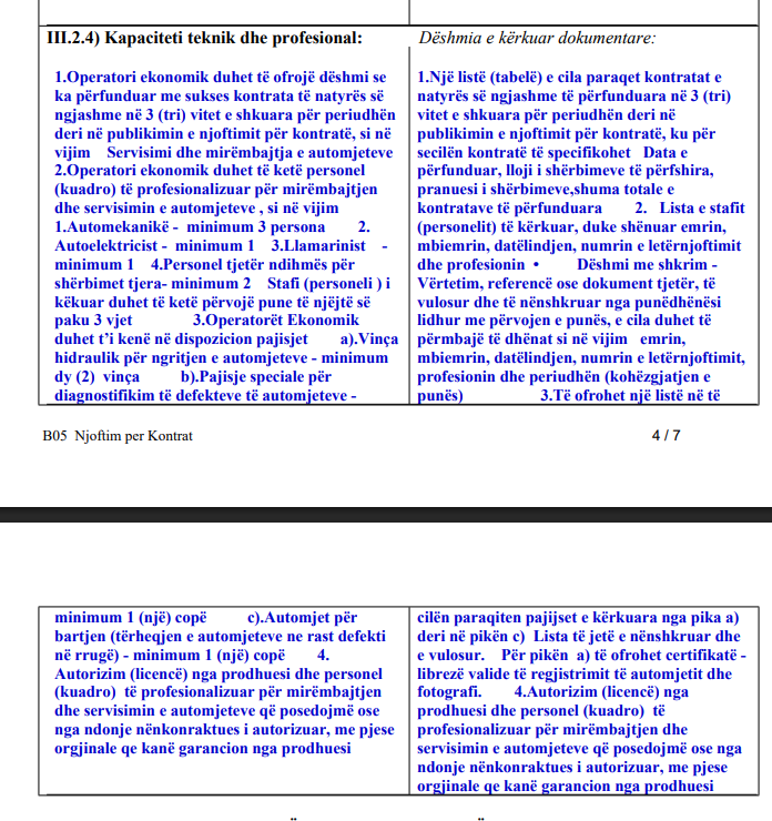 “ 1.Automekanikë – minimum 3 persona 2. Autoelektricist – minimum 1 3.Llamarinist – minimum 1 4.Personel tjetër ndihmës për shërbimet tjera- minimum 2 Stafi (personeli ) i këkuar duhet të ketë përvojë pune të njëjtë së paku 3 vjet”.