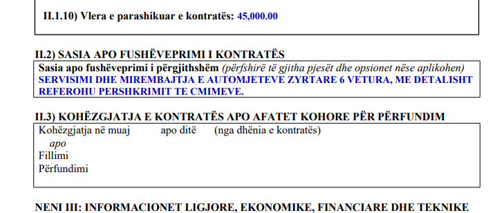 Për tenderin në fjalë janë ndarë 45 mijë euro, derisa kohëzgjatja e kontratës është paraparë të jetë për 24 muaj, transmeton IndeksOnline.